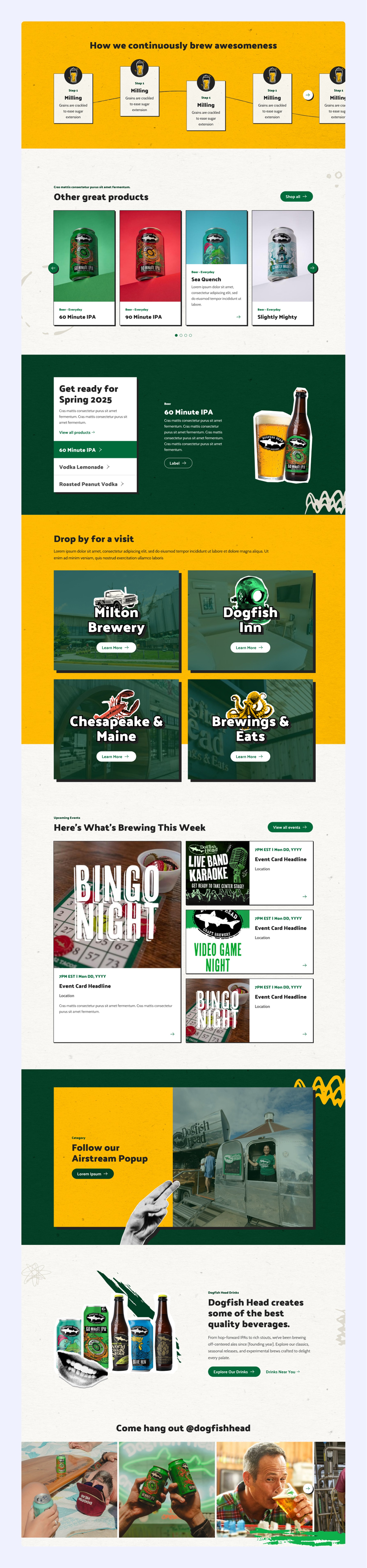 I redesigned the site with focus on brand, mobile, accessibility, and fun, pairing expressive visuals with a simplified information architecture. Bold typography, rich photography, a collage aesthetic, and playful interactions were used throughout to reflect the brand’s personality. In doing so, I crafted a flexible design system that enables easy content updates and campaign launches. The result is a site that feels distinctly Dogfish Head while delivering a cleaner, more intuitive experience.