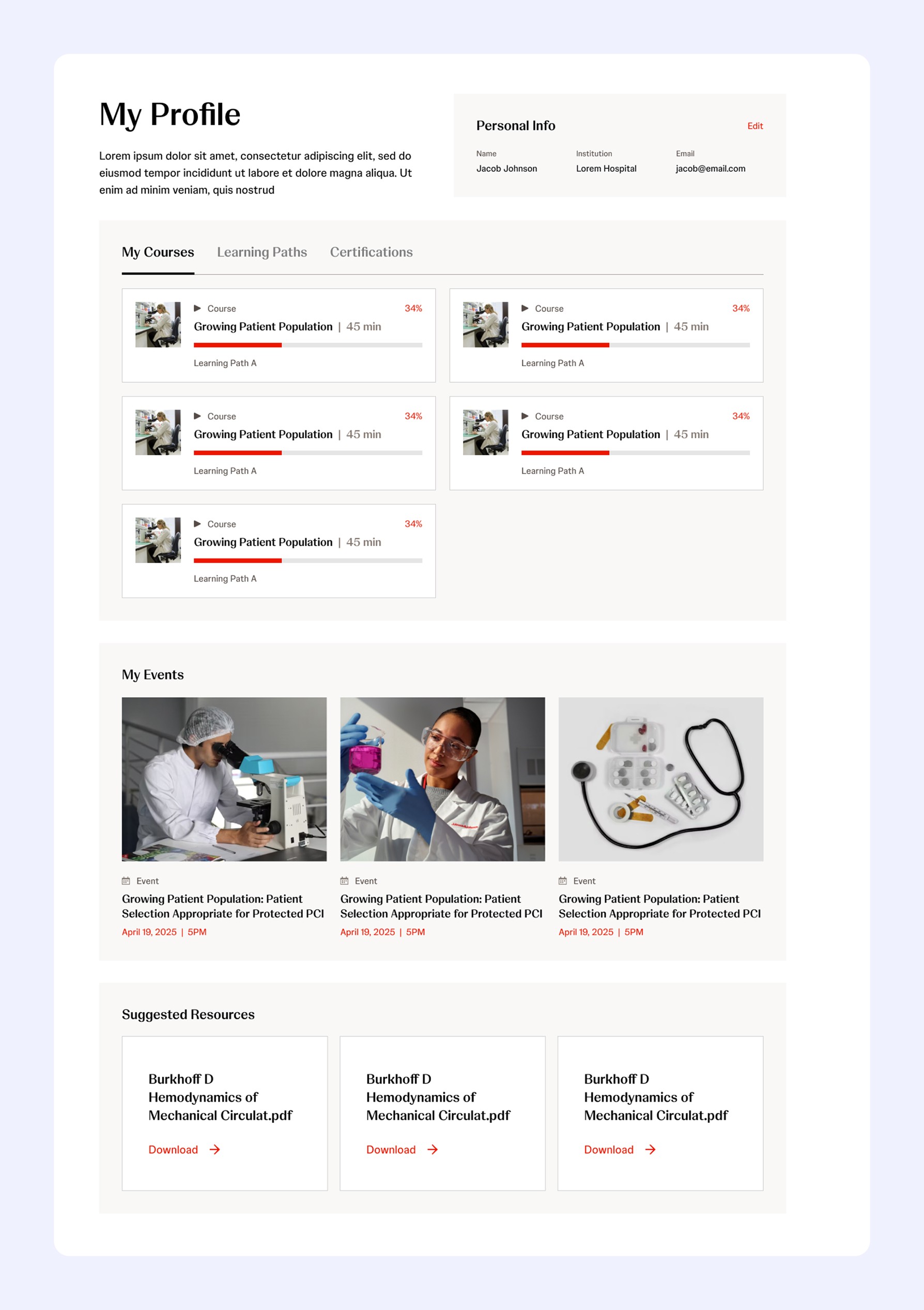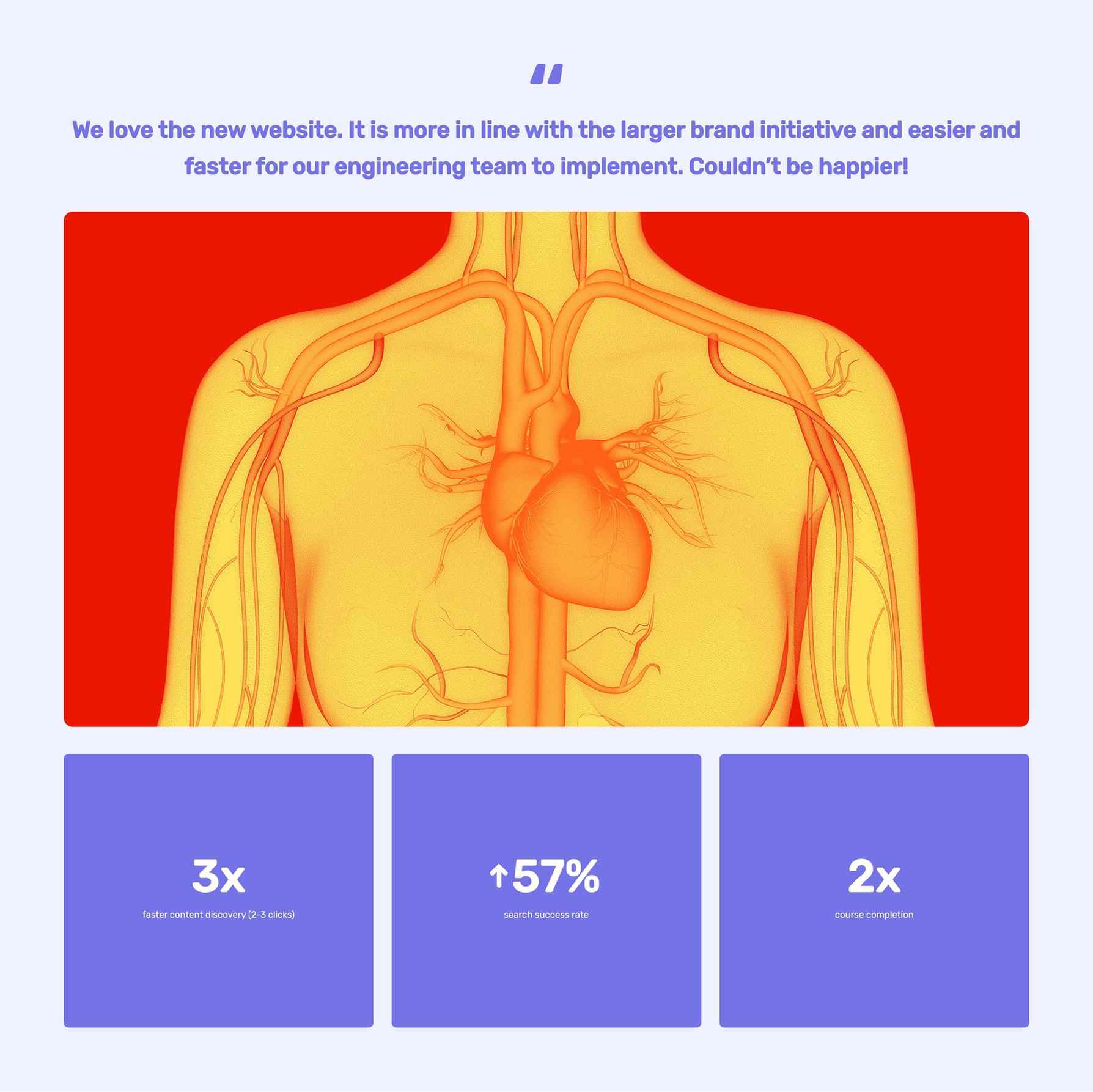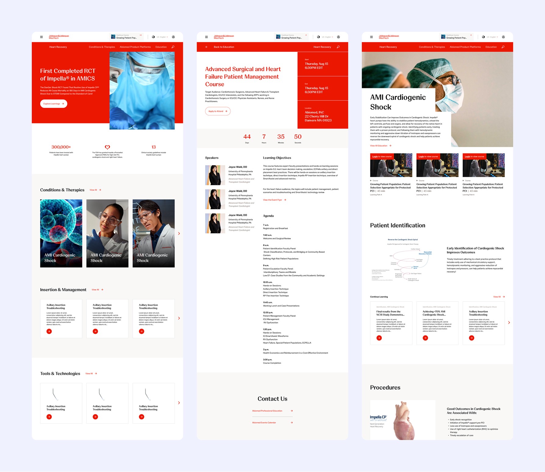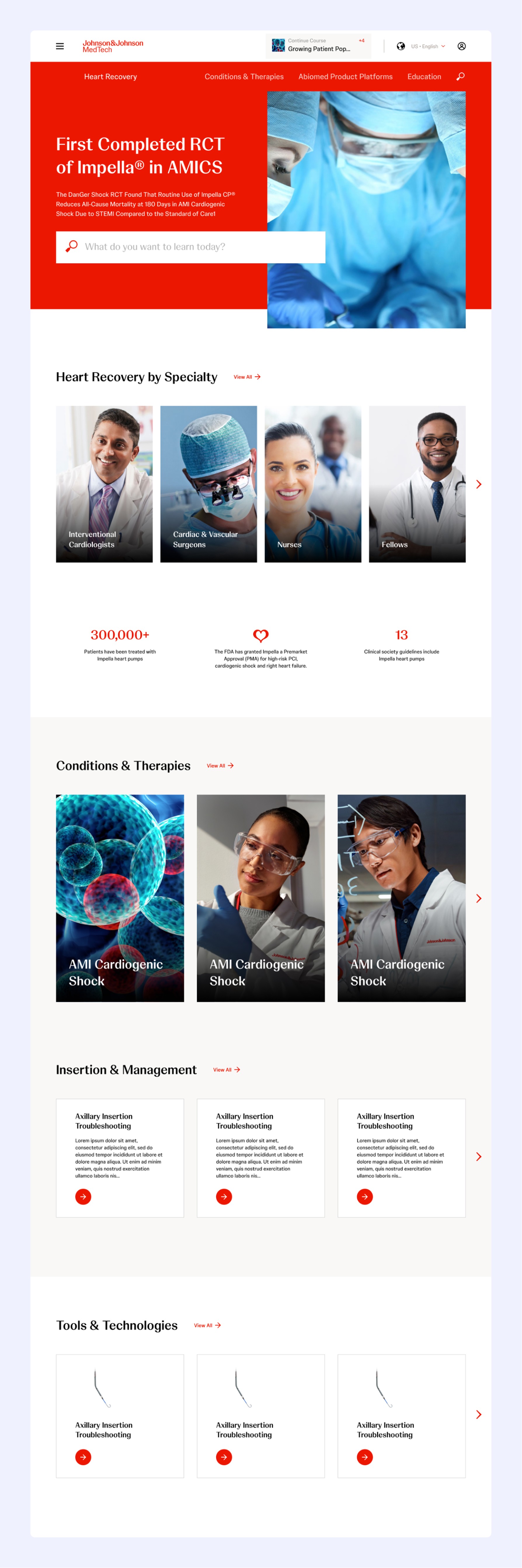 After being acquired, HeartRecovery needed a unified, clinically oriented, and scalable system that aligned with J&J’s brand while making education faster and easier for clinicians. The experience was fragmented across three separate sites, mixed legacy Abiomed patterns with new branded elements, creating inconsistency, and offered an extensive but hard to navigate content library. The redesign needed to address all of these things.
