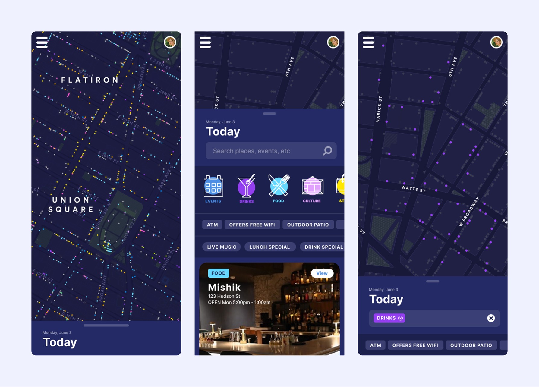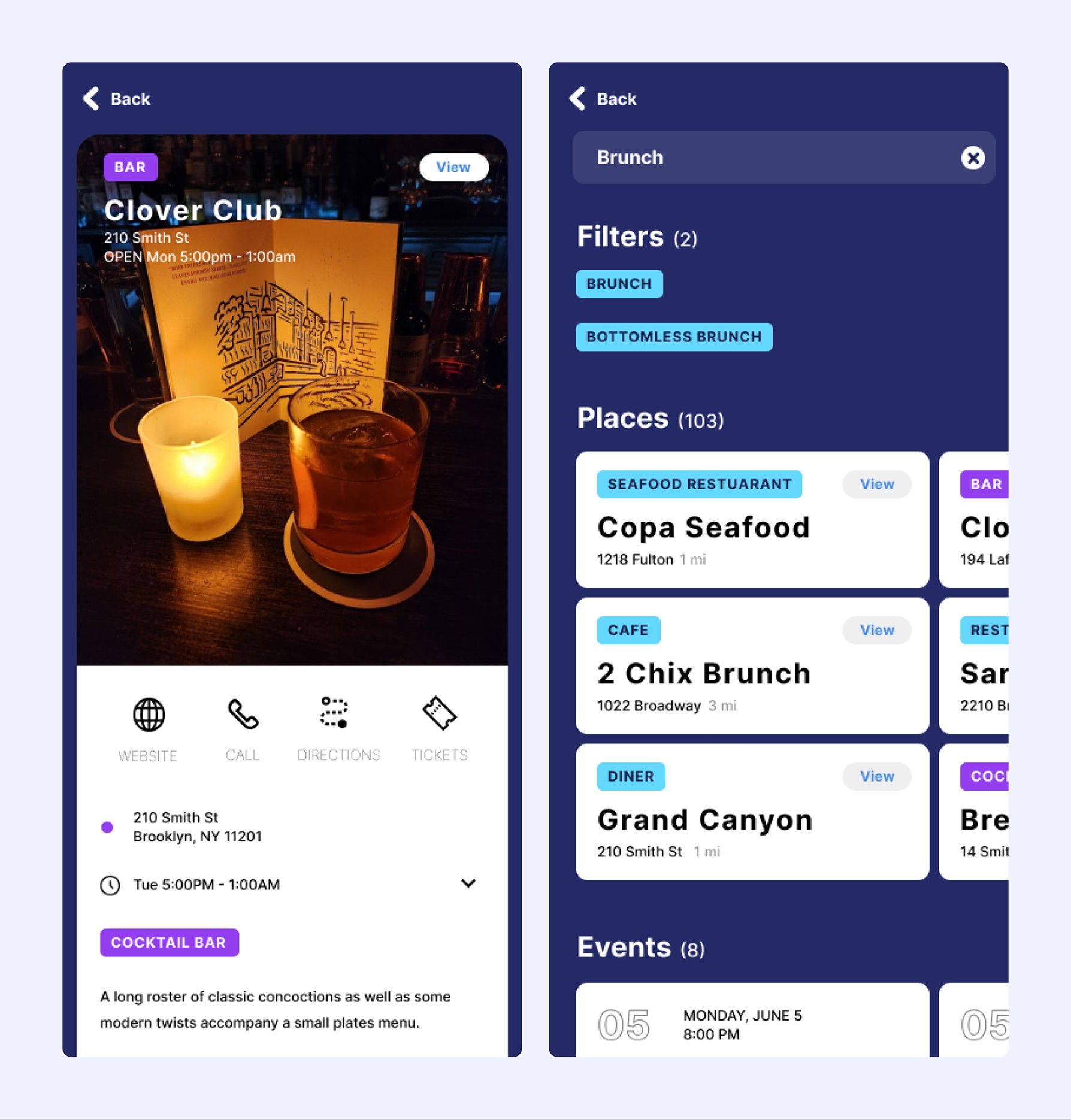 Once the data was collected and stored, the features of the app started coming together. Users could search or filter businesses and events by type, tag, location, time of day, and more. They could also browse nearby and discover as they walked around exploring the city. They could even create and follow user generated curated lists, creating a community within the platform.