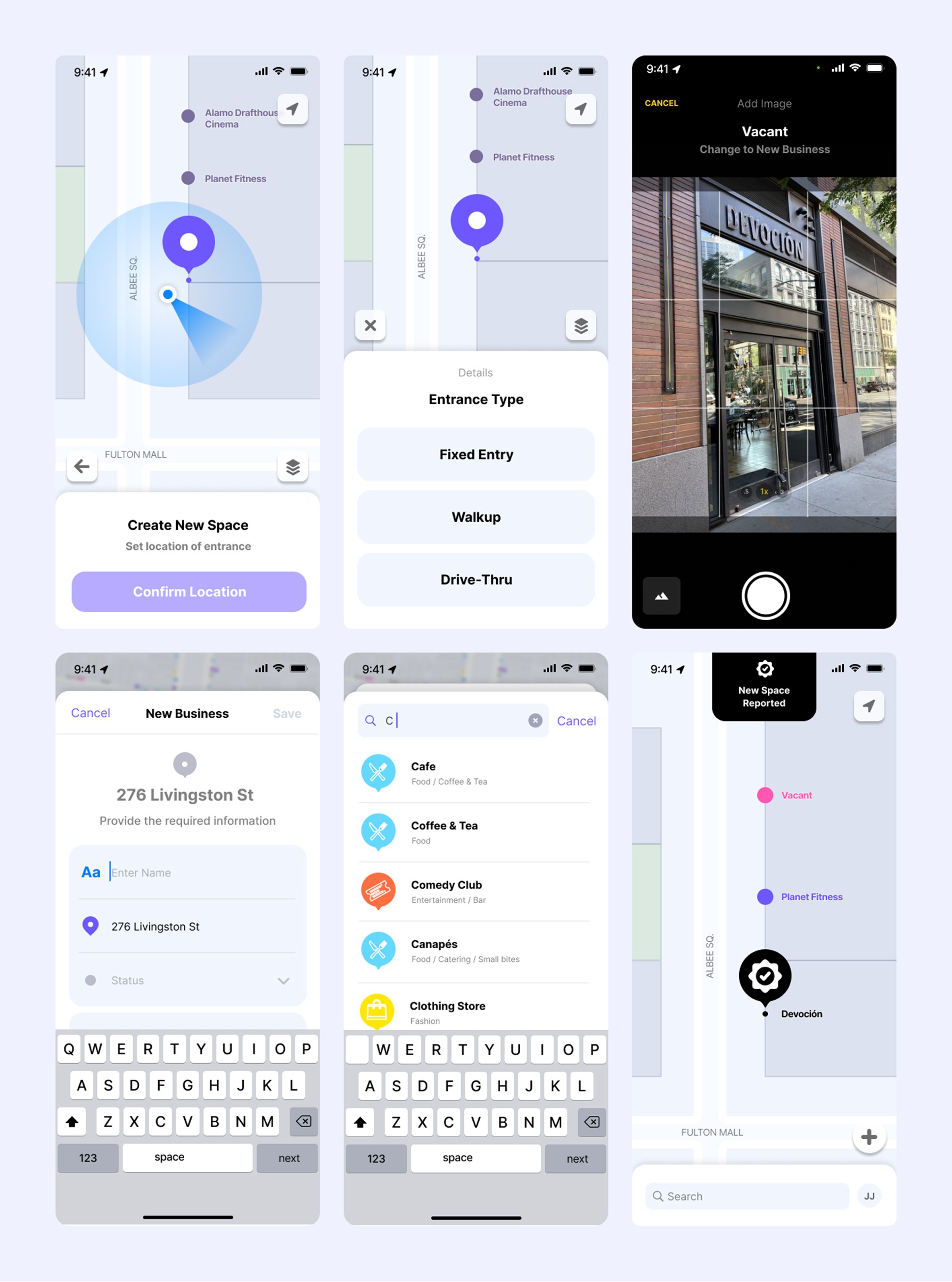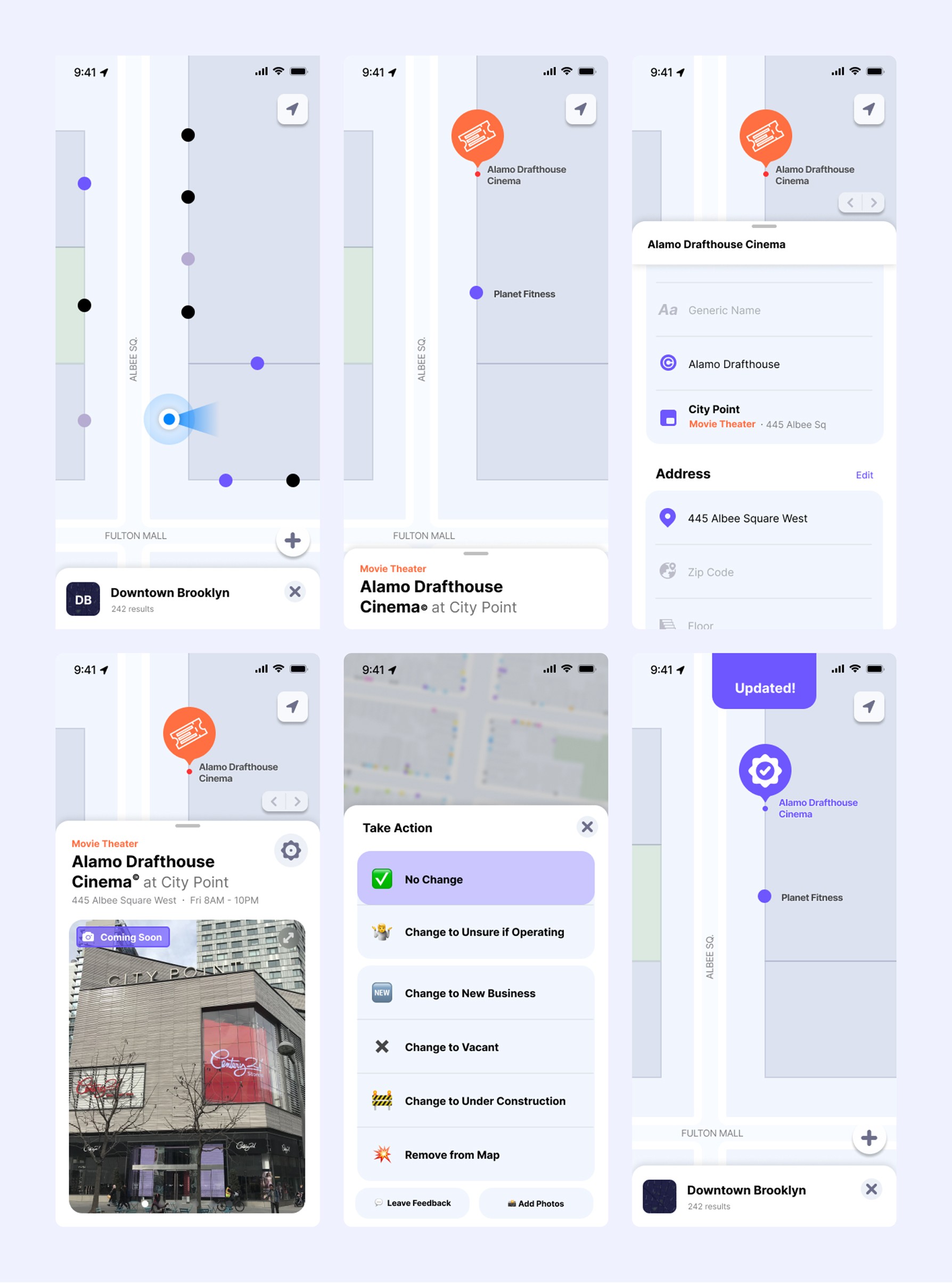 Live XYZ aims to map every place and event on every block. This includes indexing businesses of all kinds and mapping them to the actual front-door entrances, whether on the side of street or in a mall. Live does this by literally sending mappers out to walk every block and manually plot every space as a dot on their map. My goal was to make this as efficient and accurate as possible. The faster the process was, the more frequently the city could remapped.