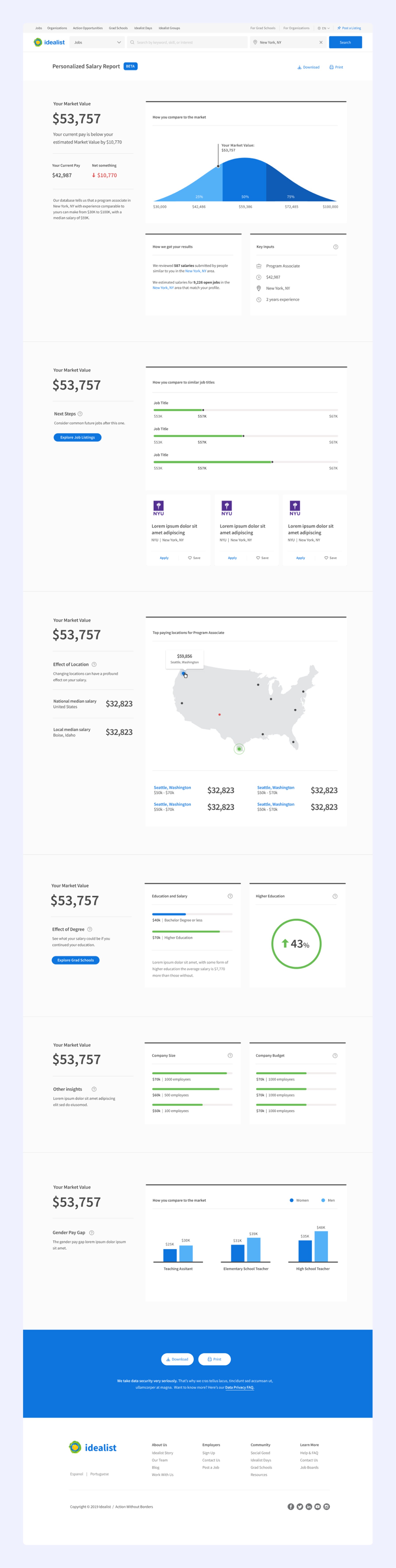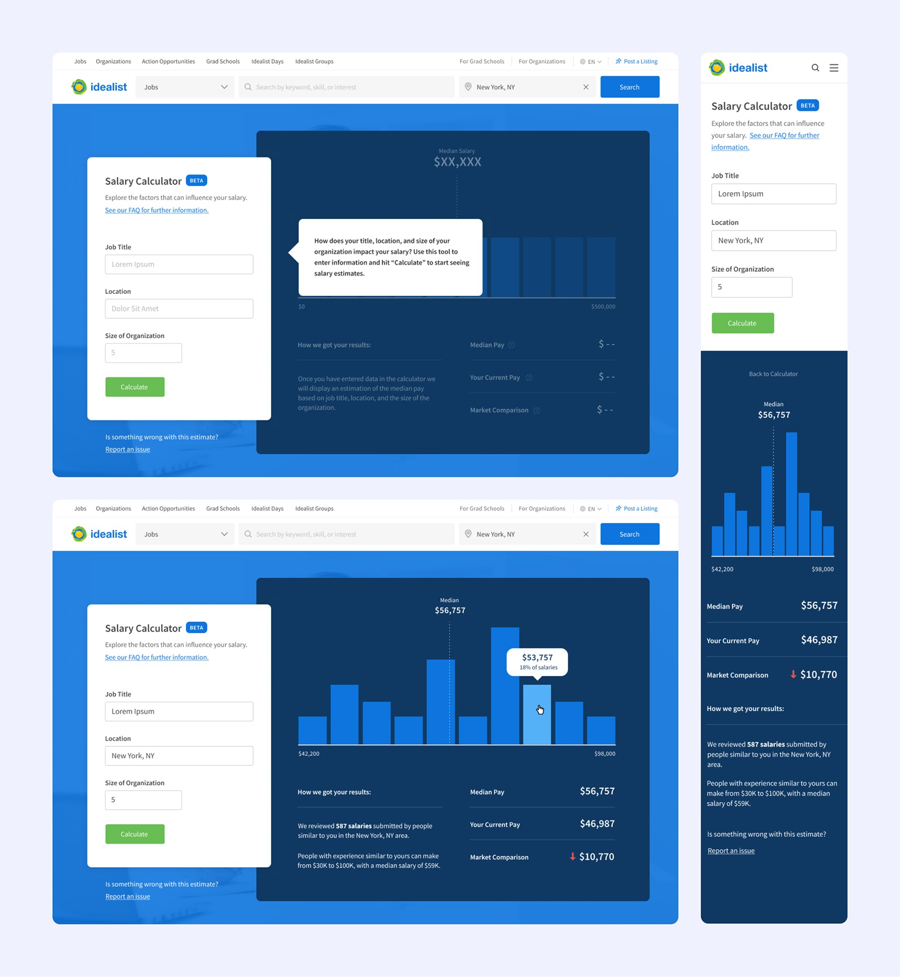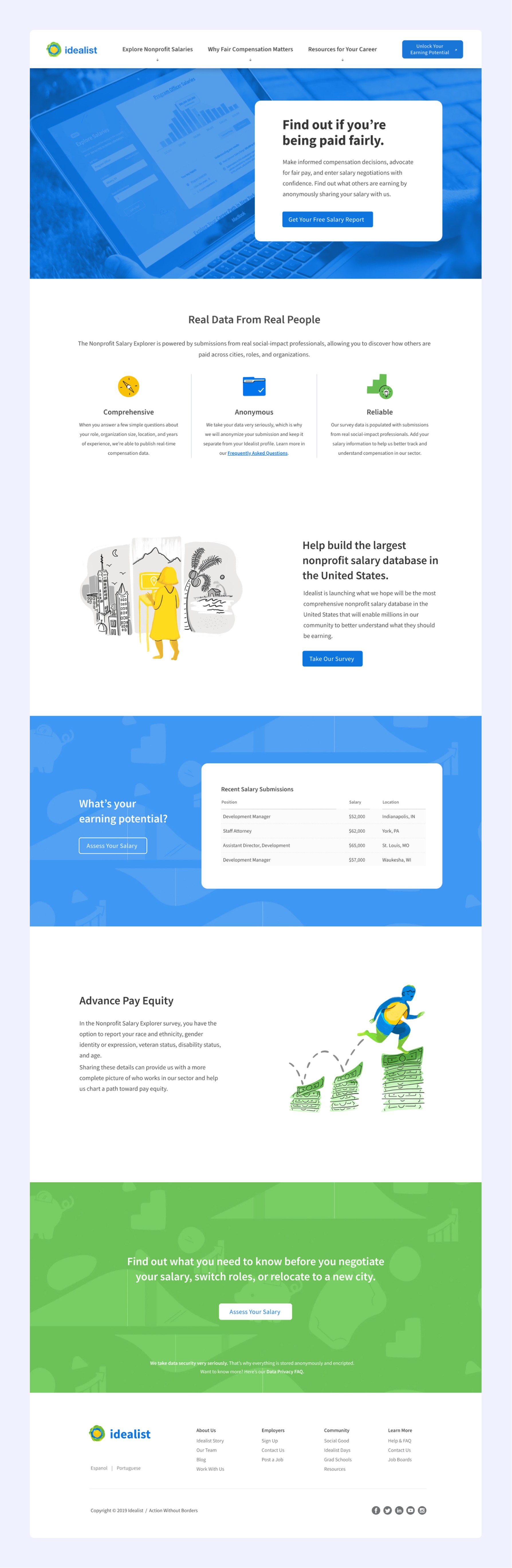 Idealist, a nonprofit job board and pillar of the nonprofit community, wanted to create a tool that advocated for salary transparency, fair pay, and informed decision making when it came to nonprofit careers. Not only would this product help employees, but it would also inform employers about larger industry standards.